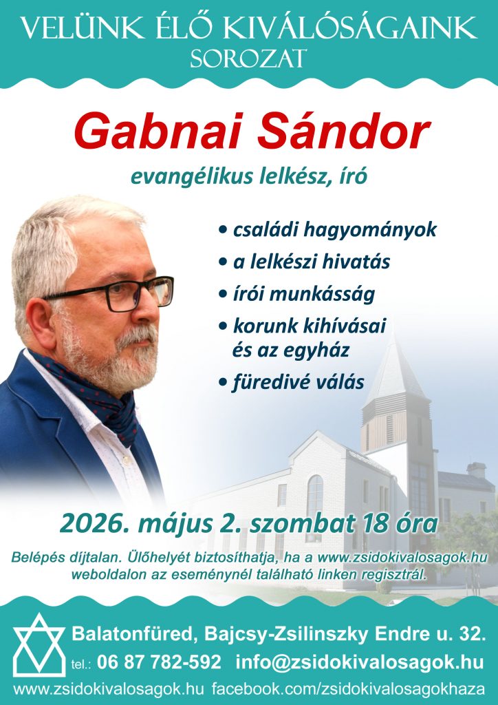 Május 2-án szombaton, a „Velünk élő kiválóságaink” sorozat keretében vendégünk Gabnai Sándor, evangélikus lelkész, író, akivel hivatásairól, Fürediségéről és mindennapjaink kihívásairól beszélgetünk.